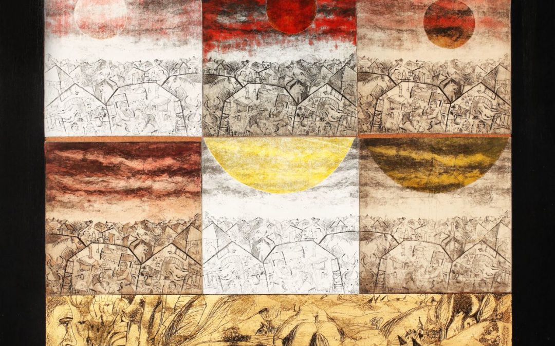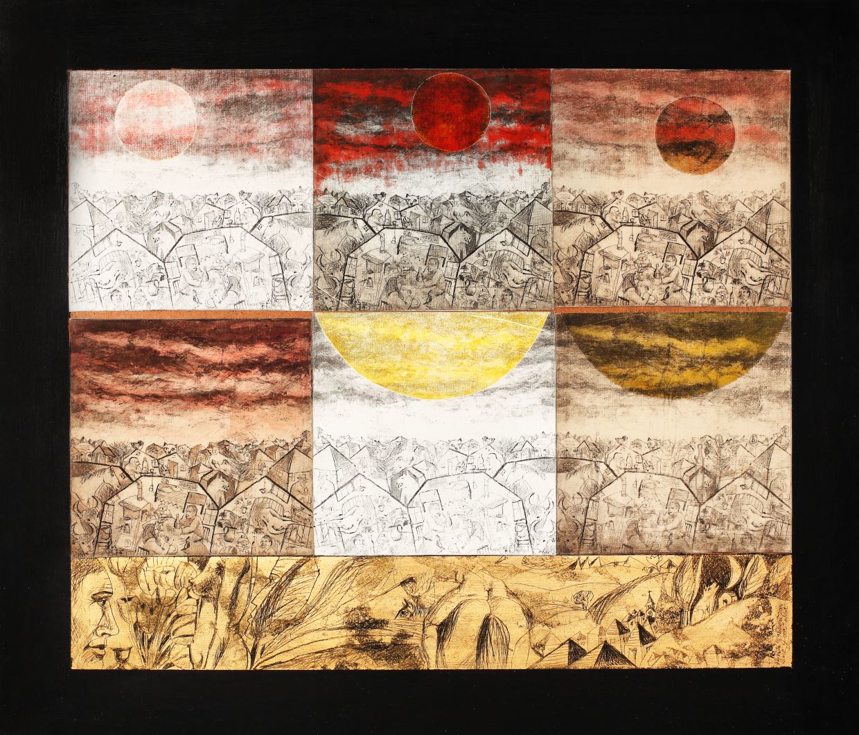 57.Mircea Nechita, Case si cer I, 2014, colaj din sapte gravuri (tehnică mixtă) si schlagmetal gravat, 49 x 56 cm